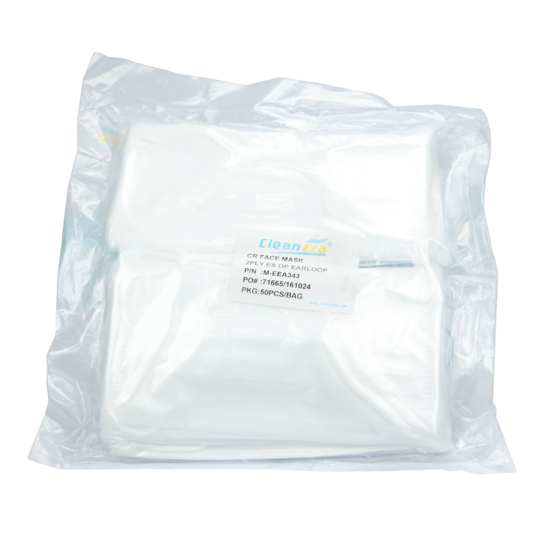 • Configured with Non-Woven Es(PP/PE)/Meltblown Polypropylene (MBPP) materials • Customized design to your specification • Optional with Earloop/Headloop/Tie-on on mask body • Manufactured and Packed in Cleanroom environment • Solvent-safe Double bag Cleanroom packaging • Ultra-low lint level suitable for critical environments | Packing : 50pc/bags, 40bags/ctn | ||